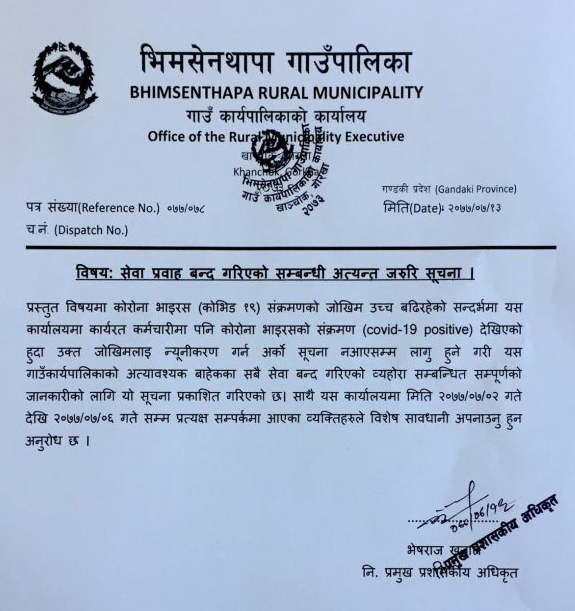 भिमसनेथापा गाउँपालिका गोरखाले आकस्मिक बाहेकका सबै सेवा बन्द भएको सूचना जारी गरेको छ । गाउँपालिकामा कार्यरत कर्मचारीमा कोरोना सङ्क्रमण पुष्टी भएपछि बुधबारबाट अर्को सूचना जारी नहुदासम्म आकस्मिक बाहेकका सबै सेवा बन्द भएको निमित्त प्रमुख प्रशासकीय अधिकृत भेषराज खनालले बताउनु भयो । गाउँपालिकाका १ कर्मचारीमा कोरोना पोजेटिभ देखिएपछि तत्काल सेवा बन्द गराएर प्रत्यक्ष सम्पर्कमा आउनेहरुको कन्ट्रयाक्ट ट्रेसिङ गर्न लागिएको गाउँपालिका स्रोतले जानकारी दिएको छ । यसैगरी कार्तिक २ देखि ६ गतेसम्म सेवा लिन गाउँपालिका आएका सेवाग्राहीलाई समेत साबधानी अपनाउन गाउँपालिकाले अनुरोध गरेको छ ।